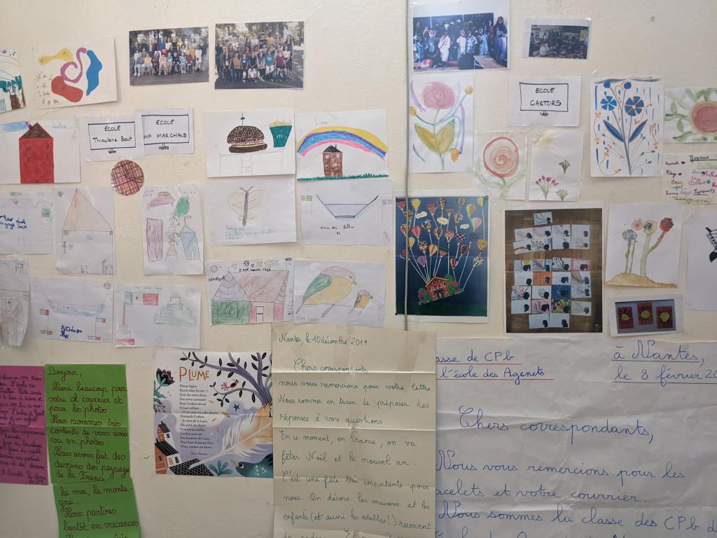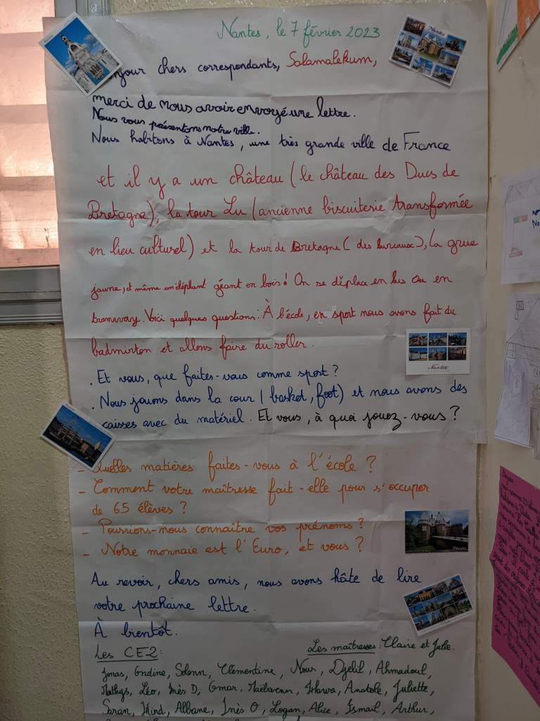 L’écriture des courriers se fait manuellement sur de grandes feuilles pour pouvoir être affichés en classe. Les courriers sont souvent accompagnés de productions d’enfants, de photographies des classes, de recettes de cuisine, de jeux mathématiques… Ce qui prime est de découvrir une autre culture, d’autres habitudes sans jugement.